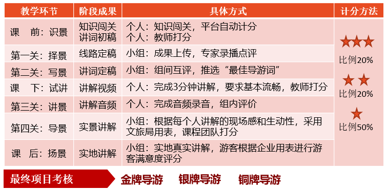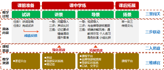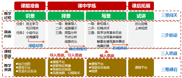 教学环节转换为识景、择景、写景、讲景、导景、扬景六关,层层推进融思政,使学生能写会说、能说会导,讲好中国故事。
