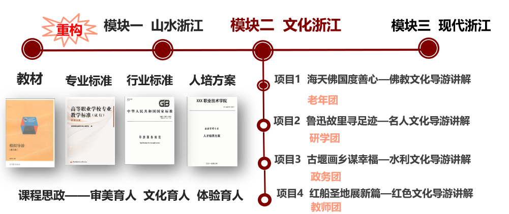 课程从导游岗位需求出发,注重培养学生的导游讲解、语言表达、导游词创作的能力,将理论与实践的高度结合,集教、学、做为一体,通过情境仿真的项目化教学方式,使学生可以掌握导游词的创作方法及导游讲解方法、技巧,从而培养出符合旅行社企业用人标准的技能型人才。基于本区域旅游资源禀赋和考证、导游比赛要求,课程采用模块项目编排方式,将教学内容整合为诗画浙江课程体系,按照景观类型和团队类型两条导游讲解任务主线,将教学内容整合为“山水浙江”、“文化浙江”和“现代浙江”三大模块,分别贯穿“审美育人”、“文化育人”“体验育人”理念,融入导游技能和素养训练,使学生在完成工作任务的同时,具备一名合格导游员的素质。