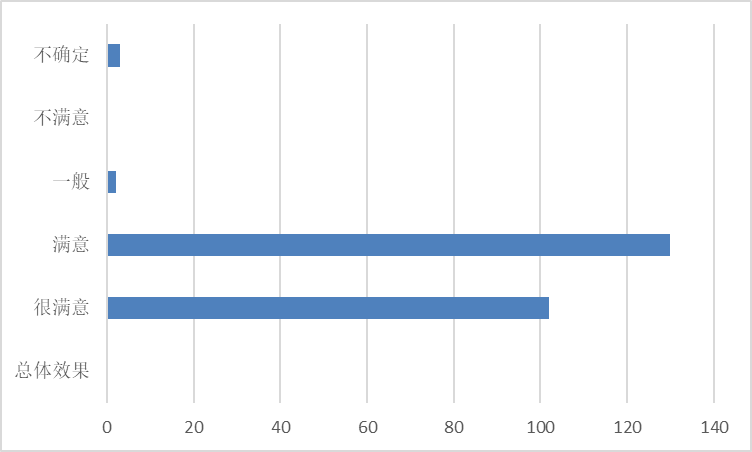在学生对课程思政总体效果的评价中,43.04%的学生很满意,54.85%的学生满意,0.84%的学生认为一般,1.27%的学生不确定效果。