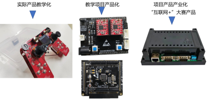 1.对接真实、创业、竞赛产品选取教学载体:剖析嵌入式技术典型应用场景,开展岗位典型任务分析,聚焦企业真实产品、AI工作室创业产品、参赛自制作品,匹配学生学习特征与认知特点选取项目载体。教学团队将实际的企业产品、竞赛项目改造为教学化项目,对部分实施的教学项目进行功能完善后形成一个实际的产品,结合互联网+的创新创业大赛,将项目产品产业化。