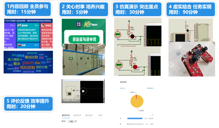 五步法:第一步,结合课前所学,利用信息化工具,了解掌握情况;第二步,将时事与技术相结合,思政融入无声无息,提高学习兴趣;第三步,教师仿真演示,突出重点,快速学会应用;第四步,虚实结合,分组研学任务,让所看所听所想内化;第五步,多方评价,及时反馈,提高学习效率。