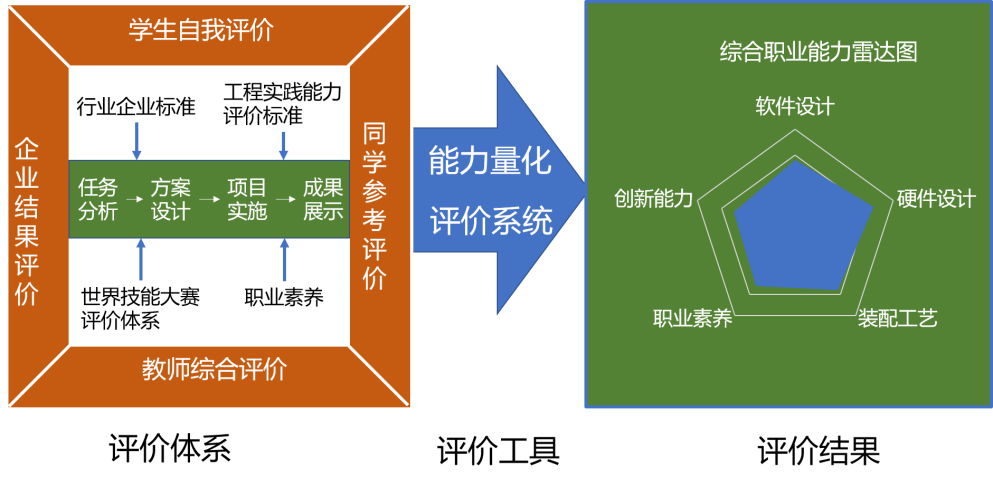 以世界技能大赛电子技术赛项的阶段式评价方式为基础,结合嵌入式边缘计算软硬件开发职业1+X技能等级标准,引入行业企业标准,细化评价指标,构建由“学生自我评价、同学参考评价、教师综合评价以及企业结果评价”的全过程“四元可视化”职业能力量化评价体系;通过分析每个项目、每位评价主体的评价数据进而实现数据的可视化,形成每位学生职业能力的雷达图,使得其所习得的能力得以量化。