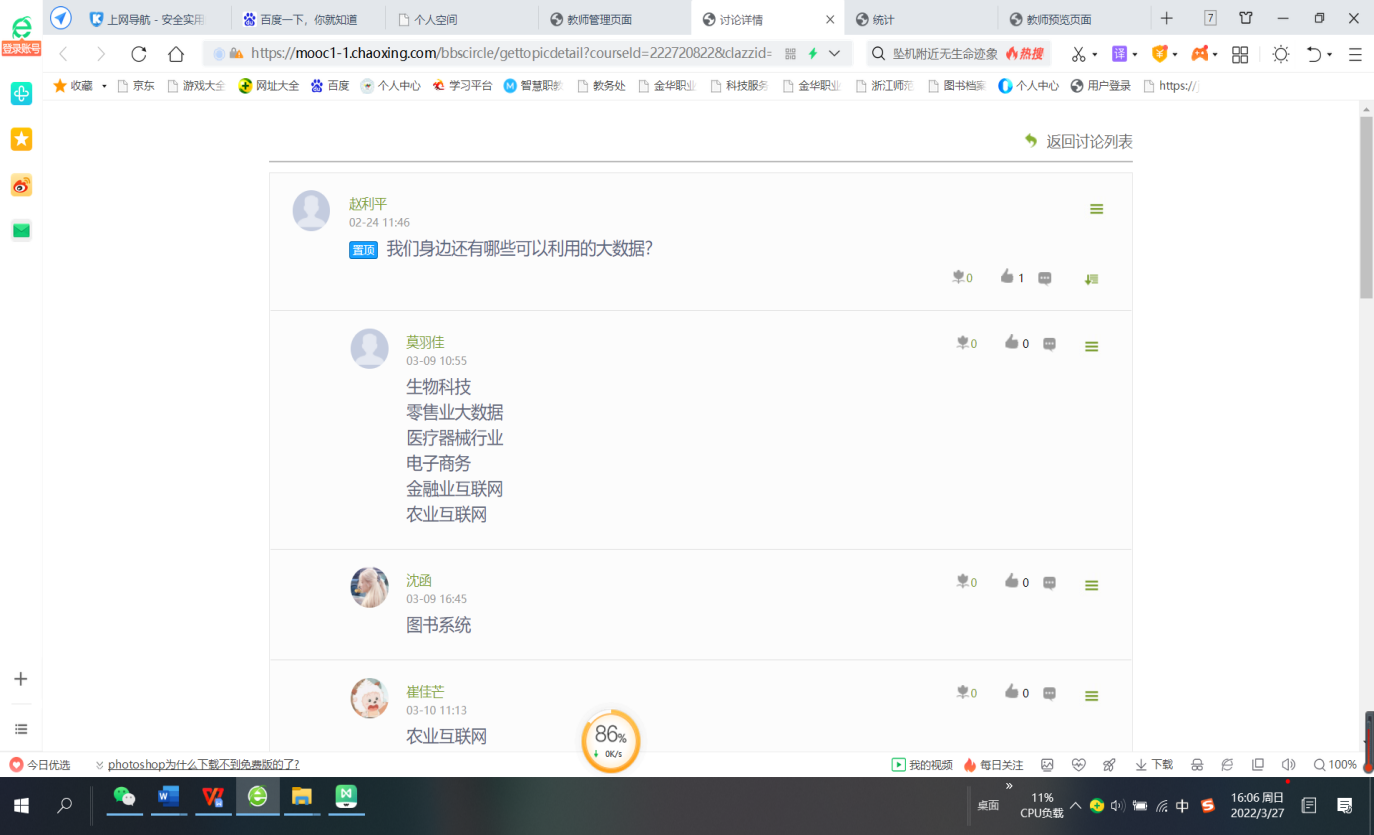 教师通过学习通发布课后作业,学生完成相关任务,观看《厉害了!我的国》章节视频:《用计算机的语言描述中国自己的农业大数据》,进一步巩固知识点。在讨论区发布课后讨论,我们身边的大数据应用还有哪些?学生可以结合所学专业,去发现大数据在专业领域的积极应用。