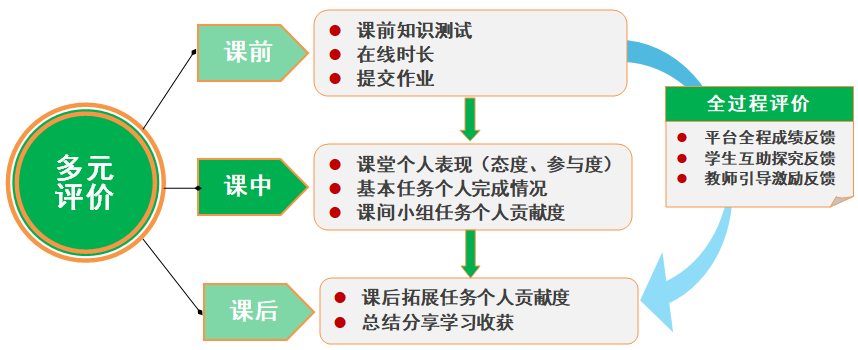 为了科学系统评价学生的学习与实践成果,对学生的课前(小组作业)、课中(抢答、讨论)、课后(视频观看、作业、主题讨论)工作成果均纳入考核评价范围,做到全时空评价。采用“学习通”平台设置分值、权重,对学生到课情况、课堂表现(举手、提问、抢答、主题讨论)、作业情况实现全过程评价,评价对象不仅包括老师对学生的评价,也包括学生对学生、小组对小组的“三元对象评价”,做到“时域、内容、过程、对象”全域评价,云端共享,时时显示。