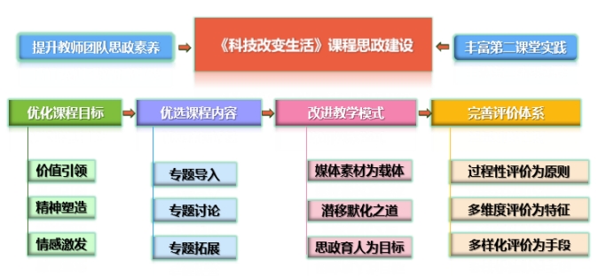 《科技改变生活》课程思政从提升教师团队思政素养和丰富第二课堂实践出发,优化课程教学目标,优选课程教学内容,改进课程教学模式,完善课程评价体系。价值塑造是育人工作的第一要务,课程将价值塑造的成分有机地融入能力培养和知识传授之中。