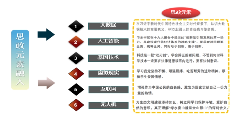 课程选择新能源、人工智能、虚拟现实、手机APP、大数据等十二种前沿科技作为专题,本案例的教学内容选择专题五大数据:大数据是信息技术发展到了一定的水平之后的一种新的处理能力,是信息技术发展的一个新的阶段,是新的信息技术的代名词,是信息技术本身。