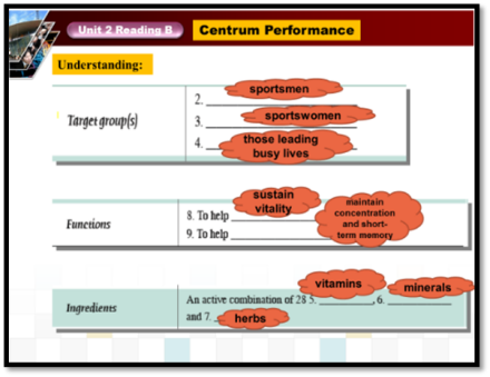 阅读学习:速读、精读Centrum Performance课文,学习新药药品成分表达。在用心读中注重学生的职业技能培养。