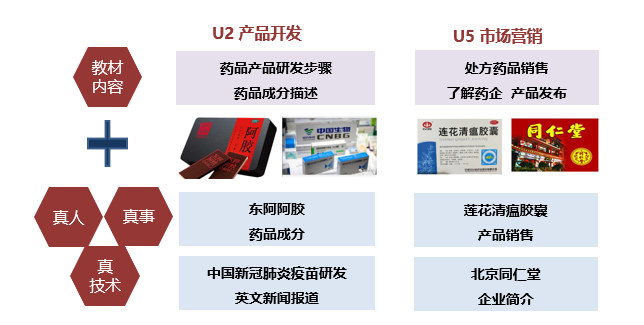 | 1.案例教学: 疫苗研发进展 2.实践项目: 东阿阿胶 药品成分描述 | 多媒体 英文新闻 学生发言 |