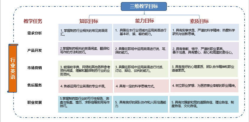 结合我校办学定位、制药专业特色和英语课程课程标准,本课程教学致力于让制药学生具备在本行业领域内运用英语进行交流、处理职场相关业务和跨文化交际能力的职业要求。经过精心选材,我们把教学内容整合为“需求分析”、“产品开发”、“市场销售”、“售后服务”、“职业发展”五大模块,希望提升学生语言基础知识和语言技能的同时,也做到价值引领。