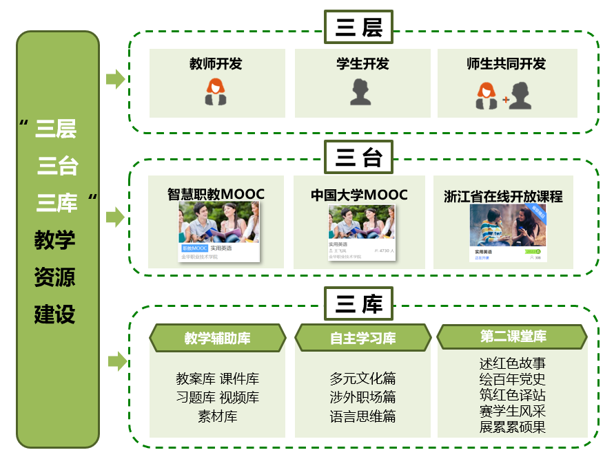 用教学辅助库、自主学习库、第二课堂库“三库”多样化拓展思政教学资源,共筑英语课程全员全程全方位育人。广泛选取渗透中国故事又放眼世界的教学辅助素材,增强课程思政的内容吸引力;严格甄选多元文化、涉外职场、语言思维等自主学习库,增强课程思政的思想引领力;有效运用“述红色故事”“绘百年党史”“筑红色译站”等形式多样的英语教学实践第二课堂库,增强课程思政的精准影响力。