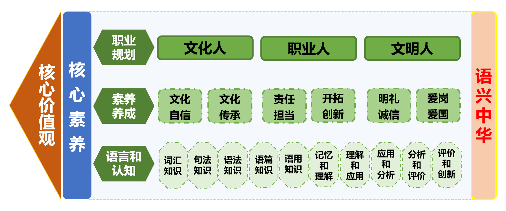 语言技能包括语言记忆、理解、应用、分析、评价及创新,提升与职业岗位相关的英语应用能力,培养学生责任担当、开拓创新的职业素养,增强择业自信心。