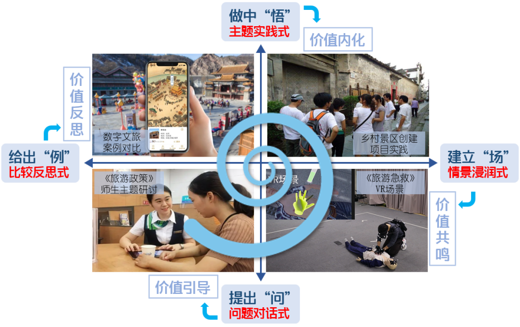 充分发挥智慧课堂灵活的教学优势,在教学方式上嵌入思政元素。改良由竹内弘高在20世纪90年代提出的“知识螺旋”理论,设计基于案例、基于情景、基于对话和基于项目等教学载体的反思式、浸润式、对话式、实践式教学,通过建立“场”促进价值共鸣;通过提出“问”促进价值引导;通过给出“例”促进价值反思;通过实践“项目”促进价值内化,实现在旅游类专业课堂教学中达成“润物无声”的育人目的。