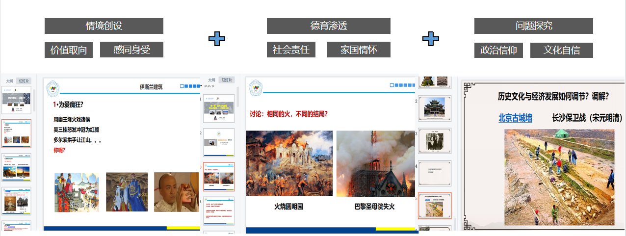 采用情景创设+德育渗透+问题探究的课堂教学方法,让学生能“设身处地”的沉浸式感受建筑背后的震撼,激发学生的学习兴趣。