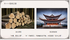 2.展示图片,引导学生感受木材的生命力。 为什么中国人对木材情有独钟呢? 首先是木材资源丰富,使用方便。其次,木材的生命力极强。古人云“木者,春生之源”,白居易有诗“离离原上草,一岁一枯荣;野火烧不尽,春风吹又生”。在五行学说中,东南西北四个方向分别用“子午卯酉”来表达,“卯木”代表东方,也就是我们常说的左青龙,代表尊贵和生生不息。古人用12生肖来计月,正月寅木就是春天的开始。 商鞅变法有徙木立信,也向我们反映了木头的优异品质。木材经过能工巧匠的精雕细琢用在古建筑中则以另外一种形式延续生命。 | 回答有关描写木材品质的古诗词和典故 | 微信群发布问题 学生手机抢答 | |
