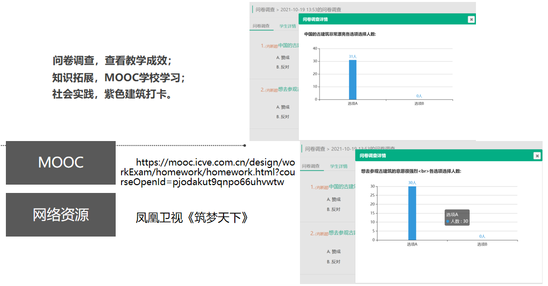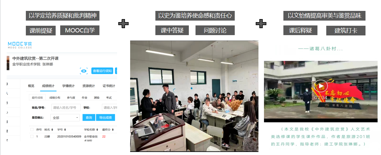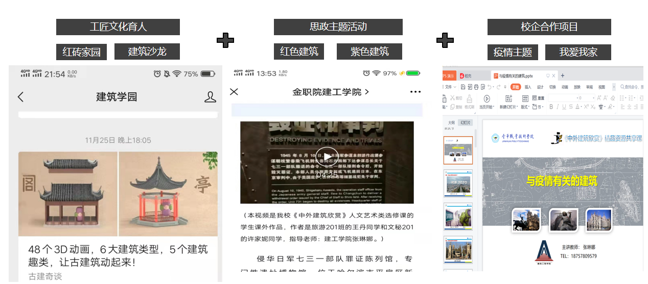 通过结合建筑工程学院建党百年“六个一百铸魂”打卡百座建筑活动,将建党百年活动融入课堂,“百年华诞、青春献礼”作为课后作业,打卡金华地区的红色建筑,我爱我家教学环节中,打卡金华特色建筑或自己家乡的代表建筑,学生通过团队合作进行视频的拍摄、剪辑、配音、字幕等手段“强制性”近距离的接触建筑,将课堂延伸至室外,做到知行合一。