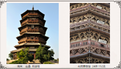 3.展示图片,引导学生体验木材的抗震性; 有人说因为木材的特殊性,不能造高层。那我们来看一看,建于南宋的应县释迦塔,塔高67米,相当于现在建筑的22层。因为明朝一个知县的无知,破坏了塔身结构,导致有点倾斜,号称中国的比萨斜塔。史上经历了大大小小7次地震,依然静静地伫立了900年,侧面反应出木结构体系的稳定性。整个塔有24种不同形式的斗拱共152朵,称得上名副其实的斗拱博物馆。