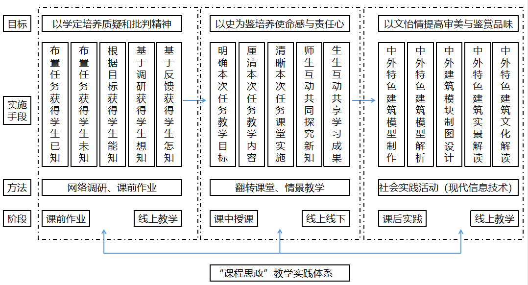 3.建设的内容:以人类发展史为主线:古代建筑——近代建筑——现代建筑的典型形制进行中西方对比,采用视频播放、PPT演示、案例分析、小组讨论、翻转课堂、三维仿真等教学方法,围绕政治认同、家国情怀、文化素养、道德修养等重点优化课程思政内容供给,系统进行社会主义核心价值观教育和中华传统文化教育。