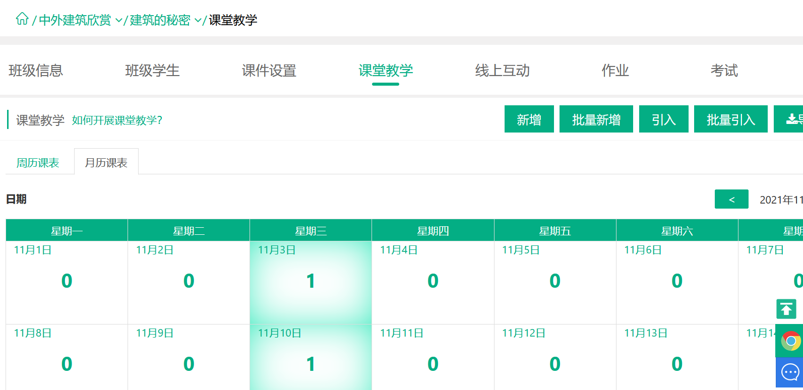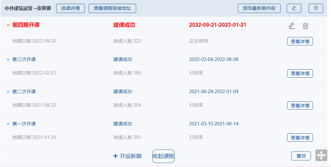2021年在智慧职教慕课学院上开放在线课程,已开展4期;同年,配套新形态教材《中外建筑简史》第三版出版发售,目前已完成全部课程资源建设供全国同类院校使用。