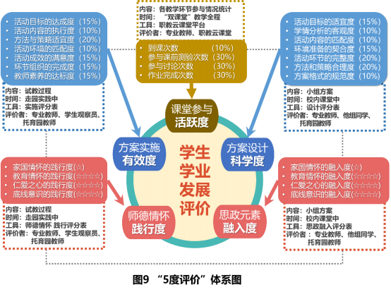 (4)架构“5度”评价体系,围绕学生知识能力发展与师德情怀养成水平两个方面的评价,从学生的过程性学习、方案的设计与实施、“厚德育幼,爱家爱国”思政的融入与践行等5个方面架构了“5度”评价体系。