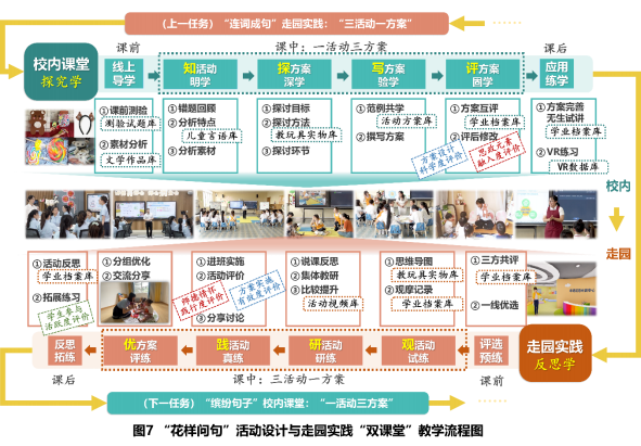 图3.“花样问句”活动设计与走园实践“双课堂”教学流程图