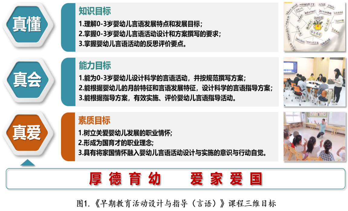 (1)提炼“3真”目标,团队成员以全国教师技能竞赛为契机,提炼出本课程的三维目标“真懂、真会、真爱”,并将思政目标“真爱”细化为“厚德育幼,爱家爱国”。