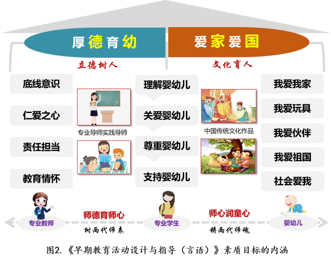 秉承“树两代师表、 铸两代师魂”师范教育理念,将“以德树人”的理念渗透本课程,引导学生树立“厚德育幼”的教育情怀。“厚德”意在培养学生的底线意识、仁爱之心、责任担当、教育情怀;“育幼”意在建构学生“理解婴幼儿—关爱婴幼儿—尊重婴幼儿—支持婴幼儿”的层层递进的职业情感。“厚德育幼”意在引导学生对教育的爱,对婴幼儿的爱,贯穿从专业教师到专业学生(未来托育师)、从未来托育师到婴幼儿两段育人过程, 实现“师德育师心、师心润童心”接力赓续。