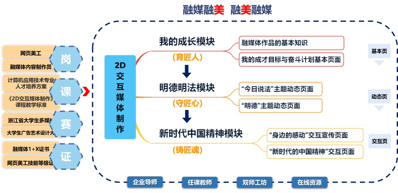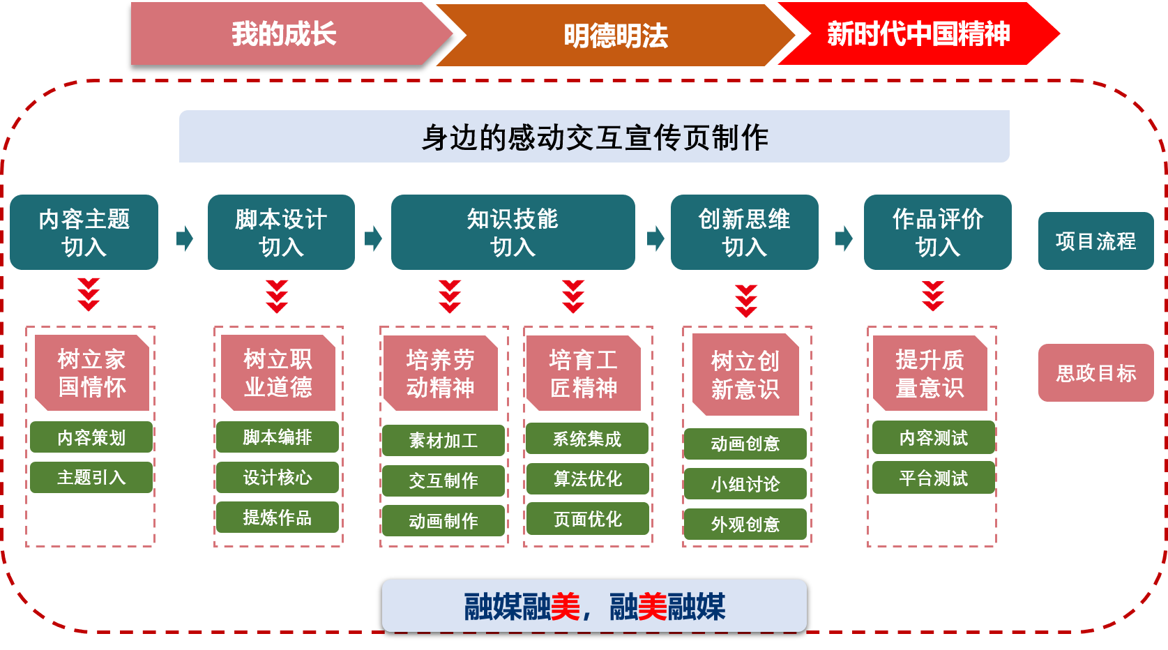 素养目标指导课程思政的内容。教学内容对标融媒体1+X证书,以“育匠人、守匠心、铸匠魂”为主线逻辑,将教学内容重构为“我的成长、明德明法、新时代中国精神”三个模块六个项目,让教师在教学的过程中,通过项目任务将教学知识点贯穿起来,学生只要完成一个项目,就能掌握融媒体作品的设计方法和技巧,将技术之美融入到作品中;通过选择制作符合社会主义核心价值观的作品,让学生在课程实训过程中能够深刻理解作品的意义,从而将思想政治教育贯穿课程始终,潜移默化中融入精神之美。同时,融媒体作品具有传播的特性,作为当代的大学生,也应该肩负起宣传社会主义核心价值观的责任。