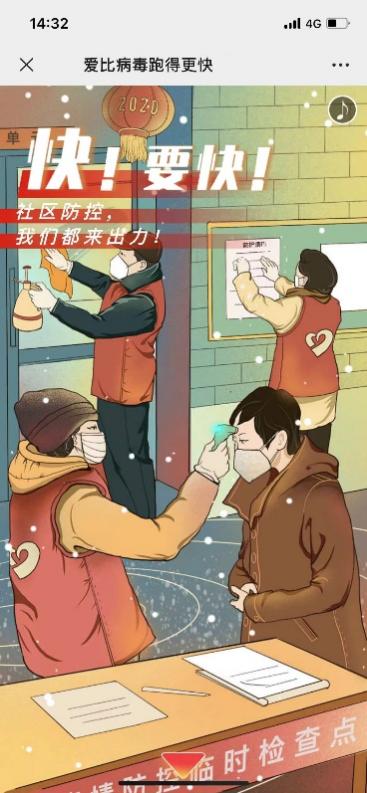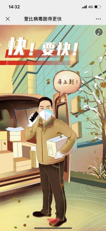 每个插画上都有“快 要快”的字样以及事件梗概,点击下方“TA们的故事”查看详情,查看完毕后点击触点滑至下一事件,依次是各地火速捐助蔬菜,爱心车队护送医生,快递小哥坚守岗位,社区工作者全力投入测量体温和宣传工作,哥俩“歇人不歇车”向疫区运送医用酒精。