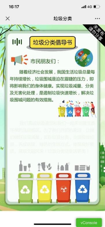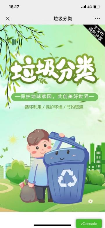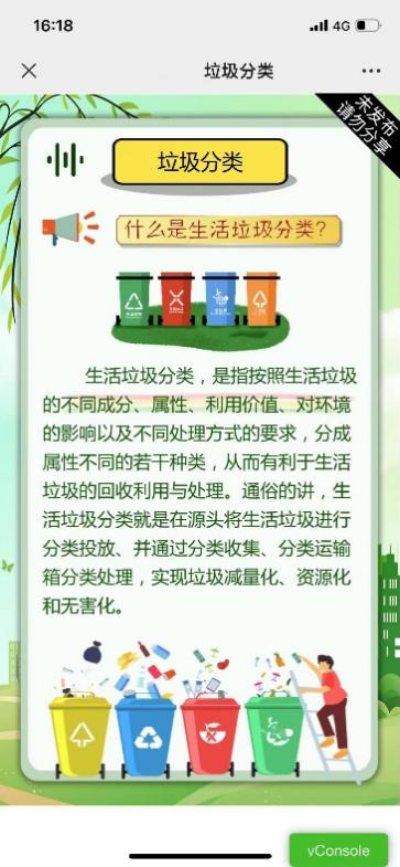关于“垃圾分类”的宣传作品,普及垃圾分类相关知识,介绍城市垃圾分类工作的规划与进程,用户参与小游戏,强化记忆,在生活中做好垃圾分类,一起加快文明城市的建设脚步。
