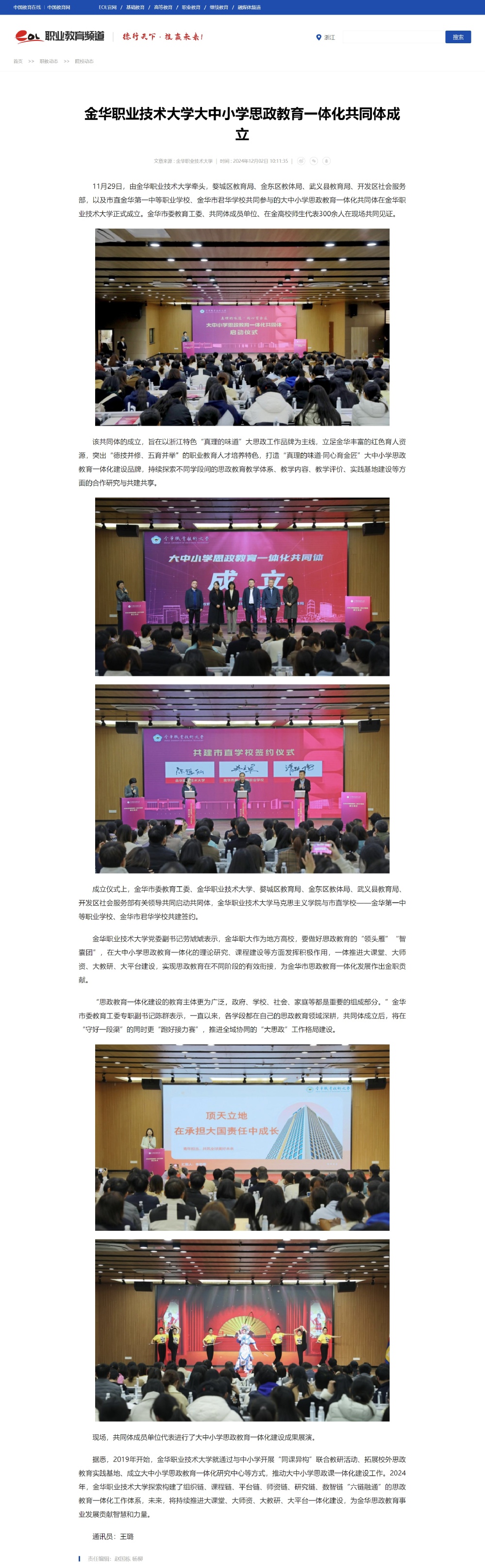 中国教育在线:金华职业技术大学大中小学思政教育一体化共同体成立
