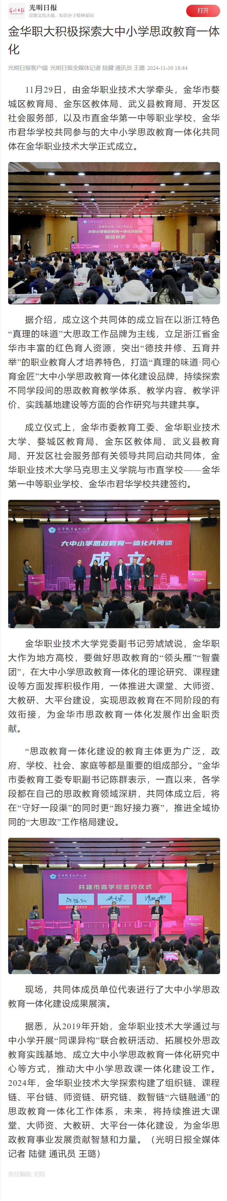 光明日报:金华职大积极探索大中小学思政教育一体化