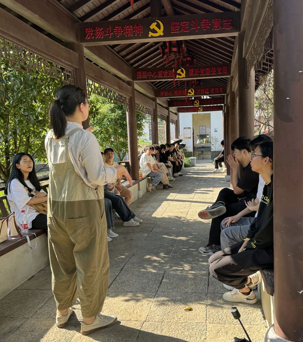到达山上之后,在里宅村的休闲长廊里,闫百灵又跟大家系统讲述了习近平总书记在浙江工作时亲自谋划、亲自部署、亲自推动的“千万工程”。另外,闫百灵讲述了“千万工程”实施20多年来取得的成就;“千万工程”内涵不断地延伸,从“千村示范、万村整治”到“千村精品、万村美丽”,再到“千村未来、万村共富”,走出了一条造就万千美丽乡村、带动万千农民群众共富的中国式农村现代化道路。最后,闫百灵让大家思考作为青年大学生应如何助力推动宜居宜业和美乡村建设。社员们听得很认真,也都积极分享了自己的心得体会。