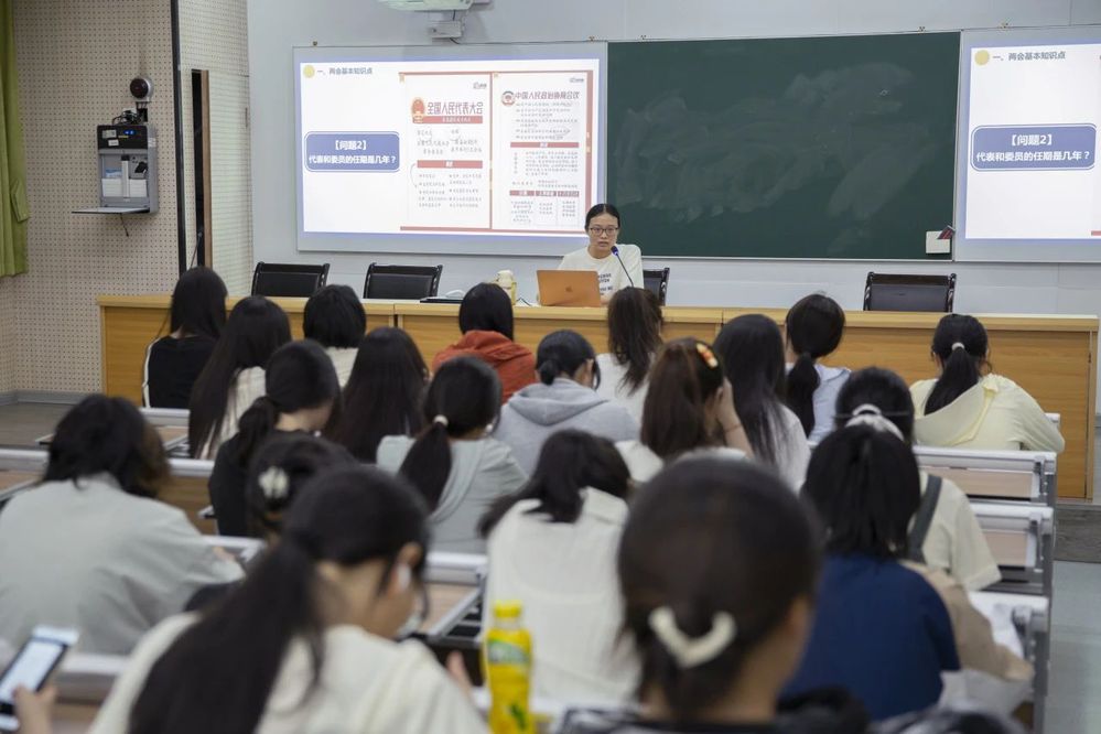 宣讲中,戴璐从“代表建议从提出到落实,总共分几步”的问题引出“全过程人民民主”主题,围绕“历史、理论、实践”三个维度深度解读“全过程人民民主”。接着,她通过与“一人一票+多党制”的西式民主优势比较,使学生真切体会到了我国的“全过程人民民主”是最广泛、最真实、最管用的民主。最后,戴璐通过举例校园的民主活动,引导学生在社会生活中践行全国两会精神。