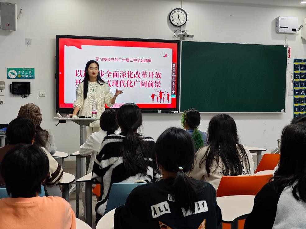 现场,在集体观看了纪录片《引领新时代改革开放》后,周菲详细介绍了当前国际形势的复杂多变与国内经济发展的新常态,强调了在这一背景下,进一步全面深化改革的重大意义。会上,周菲围绕“进一步全面深化改革”进行系统梳理,“数”说相关内容,以深入浅出的方式,帮助同学们深刻领会全会精神。