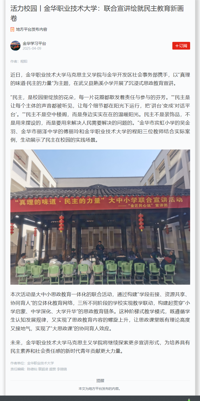 学习强国:活力校园丨金华职业技术大学:联合宣讲绘就民主教育新画卷