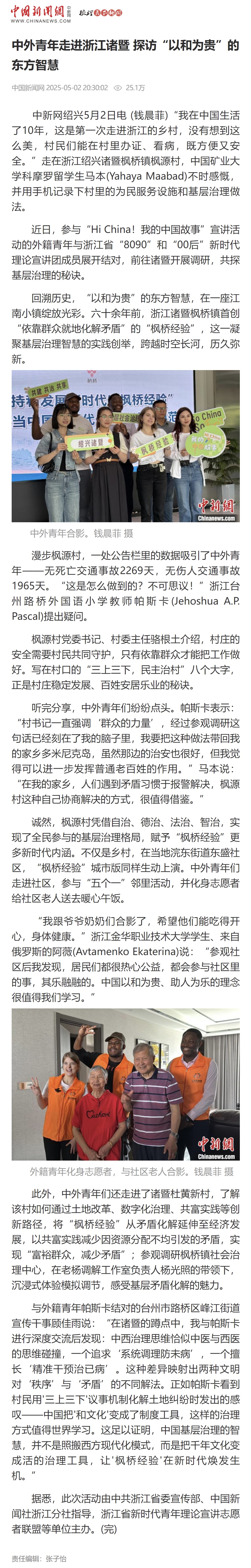 中国新闻网:中外青年走进浙江诸暨 探访“以和为贵”的东方智慧