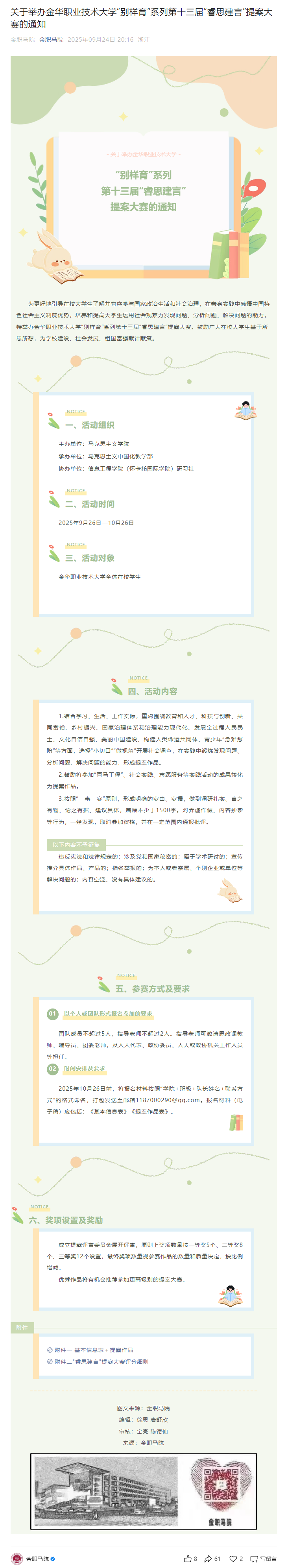 关于举办金华职业技术大学“别样育”系列第十三届“睿思建言”提案大赛的通知