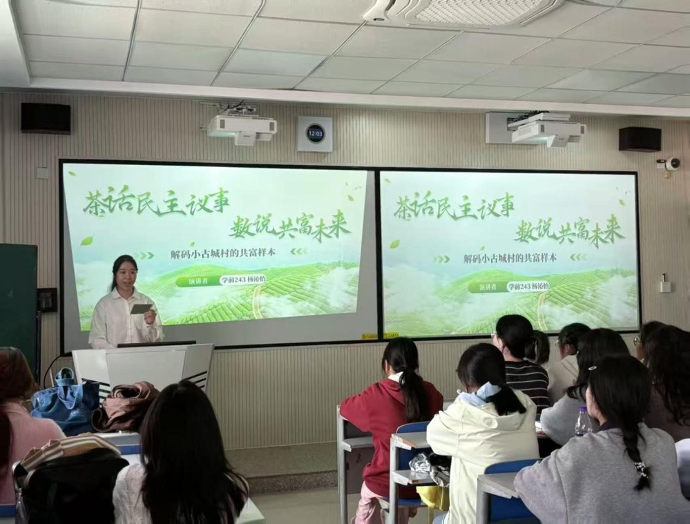杨沁怡以诗意为引、数据为基,生动讲述了小古城村在“千万工程”指引下的振兴故事。她从百年樟树下的“降墙行动”讲起,介绍了“四议六步工作法”的高效协同与“众人议事厅”数字平台的智慧治理,系统地诠释了“众人的事情由众人商量”的民主真谛。她呼吁同学们从乡村振兴的实践中汲取智慧,将“民主协商”与“共建共享”的理念融入未来的学习与使命中。