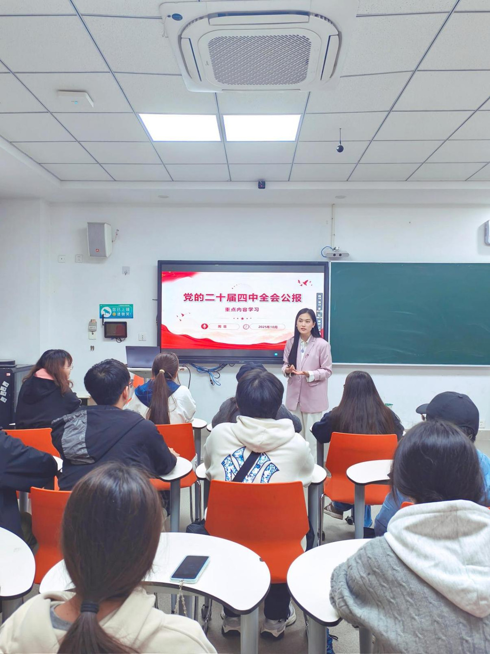 活动中,两位宣讲团成员从不同角度对党的二十届四中全会精神进行了深入解读。沈含笑以清晰的逻辑围绕会议中关于国家治理体系和治理能力现代化的战略部署展开阐述。她通过具体案例和数据,生动展示了我国在推进国家治理现代化方面取得的显著成就,并强调作为新时代青年,要深刻理解国家治理创新的重大意义,积极参与到国家发展和社会进步的实践中。周菲则结合科技创新、教育发展等热点领域,详细解读了会议中关于推动高质量发展、加强科技创新能力建设等内容。她指出,科技创新是引领发展的第一动力,教育是培养创新人才的重要基地,鼓励同学们在专业学习中注重创新思维的培养,为国家的科技创新事业贡献自己的智慧。