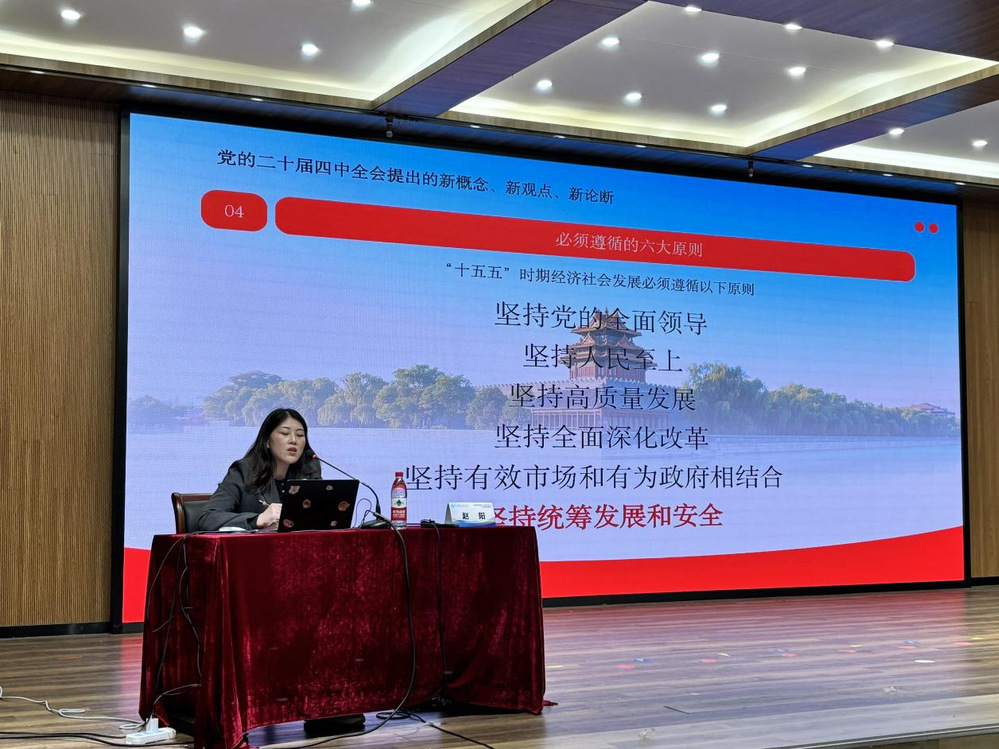 党的二十届四中全会作为向第二个百年奋斗目标进军新征程上的重要会议,为“十五五”时期经济社会发展擘画了宏伟蓝图,其中对加强基层治理、健全社会保障体系、建设社会治理共同体等工作作出了明确部署。培训会上,赵阳老师以“思当下,谋未来——深入学习党的二十届四中全会精神”为主题,从全会召开的时代背景、核心要义与实践要求三大维度展开讲解。她结合《中共中央关于制定国民经济和社会发展第十五个五年规划的建议》核心内容,深入解读了“坚持人民至上”“坚持统筹发展和安全”等重大原则的深刻内涵。