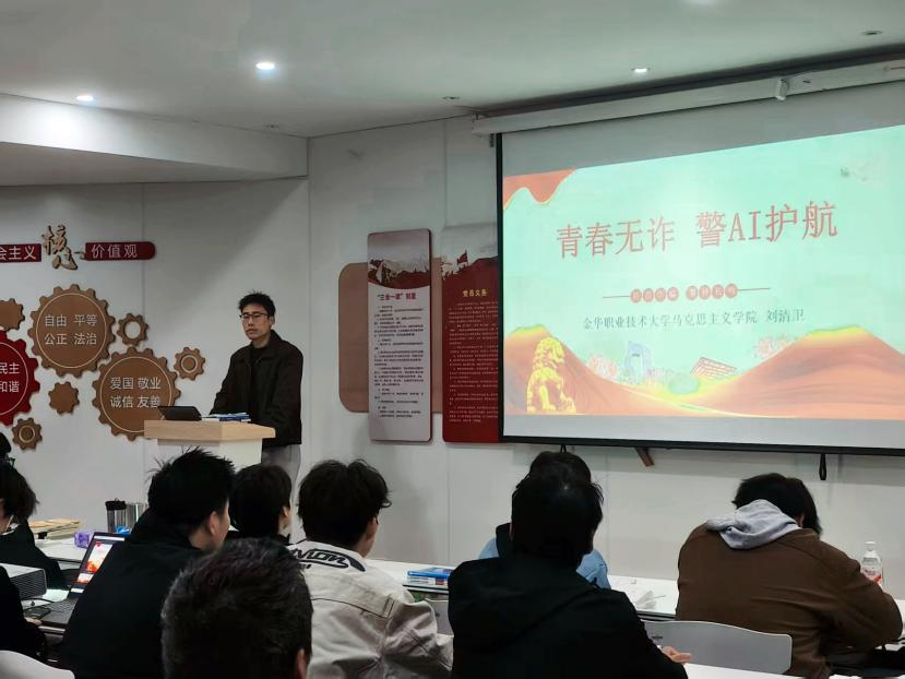 为切实提升学子安全防范意识,有效抵御新型AI诈骗风险,11月20日,金华职业技术大学马克思主义学院教师刘清卫在龙北四北二楼小会议室,以“青春无诈 警AI护航”为主题,为航空学院学子带来了一场干货满满的AI诈骗防范专题讲座。现场座无虚席,学子们认真聆听、积极互动,反响热烈。