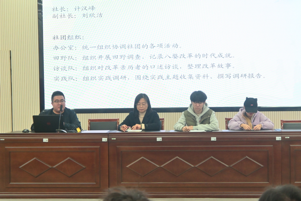 为进一步学习贯彻党的二十届四中全会精神,充分发挥红色社团作为践行党的创新理论重要载体的作用,近日,马克思主义学院教师、“红色金声”宣讲团和“青筠”宣讲团宣讲员陈春根、李娟两位老师联合指导的智能制造学院“改革先锋社”正式成立。李娟在成立大会上做党的二十届四中全会精神专题宣讲,“改革先锋社”社长计汉峰个分享人学习体会,马克思主义理论读书协会及侃轩演讲协会部分社员参与了本次活动。