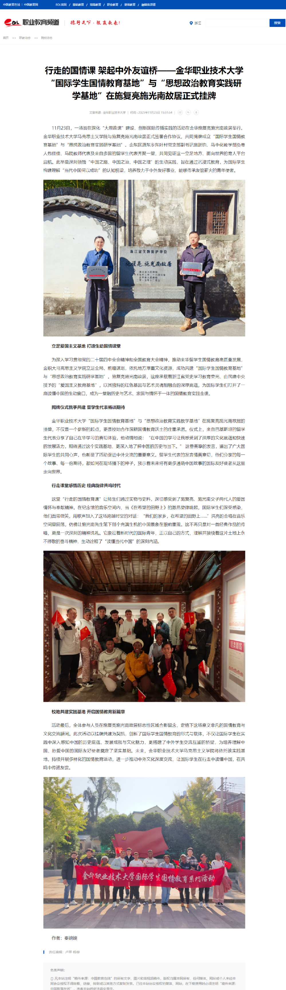 中国教育在线:行走的国情课 架起中外友谊桥——金华职业技术大学“国际学生国情教育基地”与“思想政治教育实践研学基地”在施复亮施光南故居正式挂牌