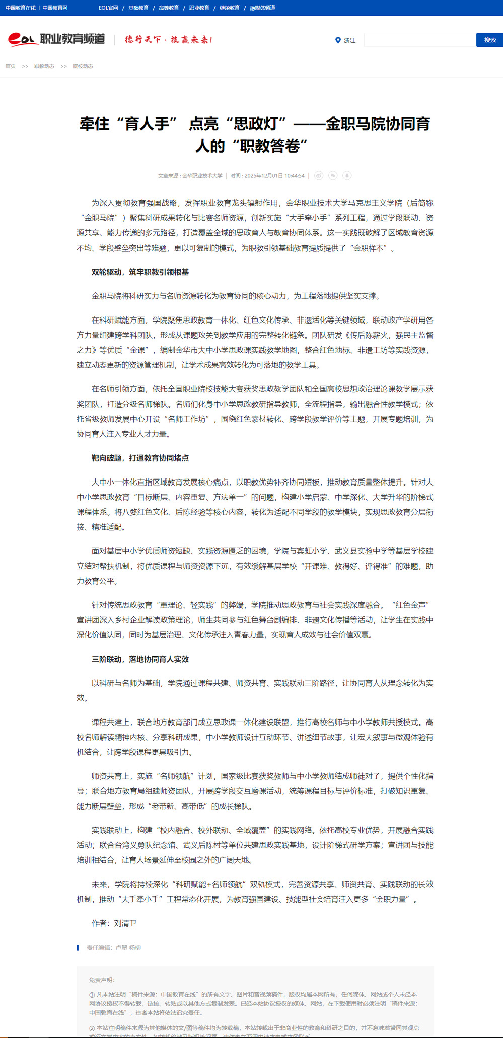 中国教育在线:牵住“育人手” 点亮“思政灯”——金职马院协同育人的“职教答卷”