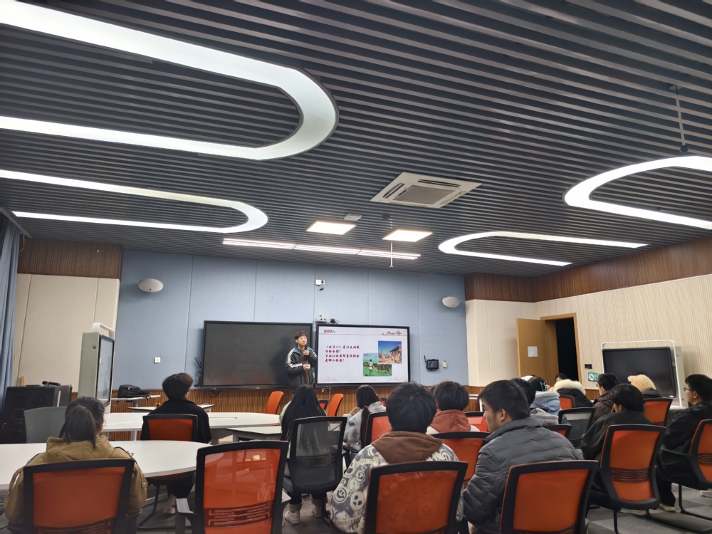 活动紧扣《牧马人》中的爱国主义内涵,以三层递进的逻辑展开宣讲,让师生在光影叙事中感悟爱国情怀,汲取奋进力量。李欣结合影片所处的特殊历史背景,细致解读了主角老许前往草原放马的人生际遇,通过串联同时代的故事,生动还原了当时的社会环境,让同学们对影片的时代语境有了更深刻的理解。他围绕老许拒绝赴美优渥生活、坚守祖国的抉择,从乡亲邻里的真挚关怀、个人情感与家国情怀的深度融合等角度,阐释了个人利益与国家利益的辩证统一,让爱国不再是抽象概念,而是可感可知的情感共鸣与价值追求。他通过提炼影片核心启示,引导同学们明确爱国的时代内涵:既要坚持爱党爱国爱社会主义相统一,筑牢信仰之基;也要传承中华优秀传统文化,凝聚民族之魂;更要以脚踏实地的责任担当、勤学苦练的本领提升,将爱国情怀转化为日常学习生活中的实际行动。