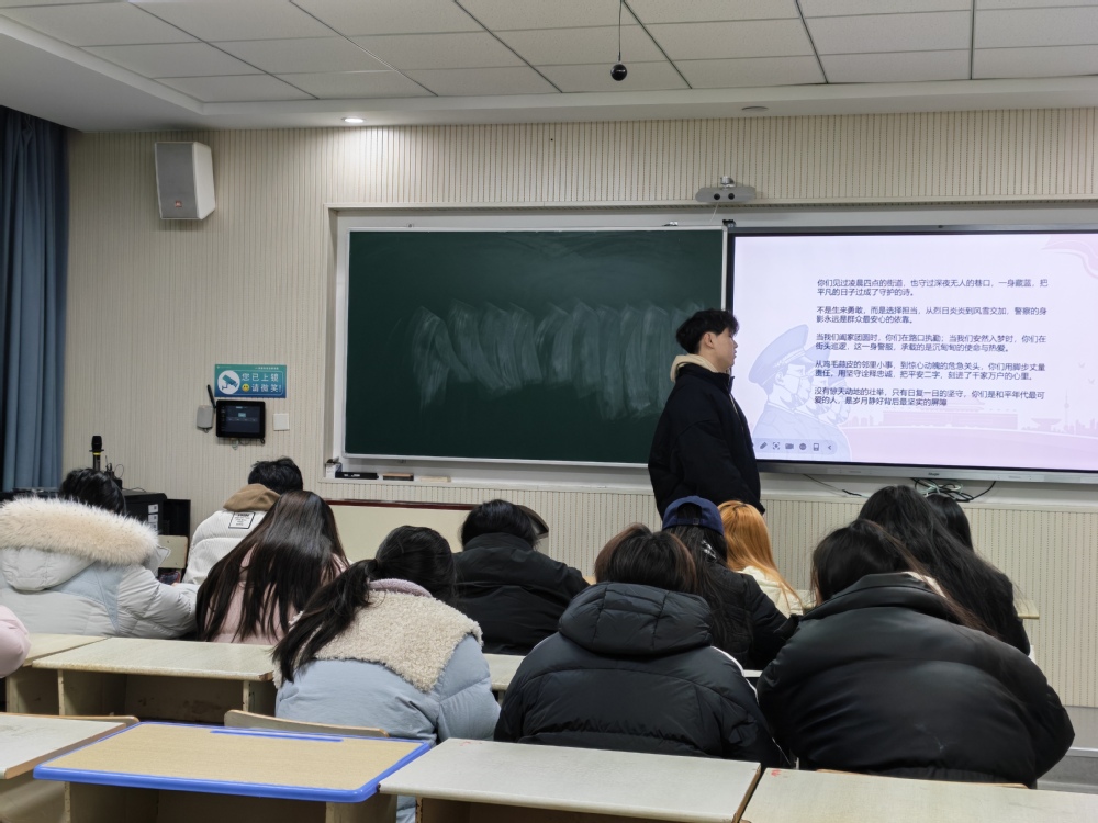 宣讲在《中国人民警察警歌》的激昂旋律中拉开帷幕。铿锵的歌词、庄重的氛围瞬间凝聚了全场目光。金超静以“藏蓝日常里的坚守”为切入点,结合一幅幅人民警察执勤巡逻、抢险救援的真实照片,将民警们风雨无阻守护街头巷尾、争分夺秒救助群众的场景娓娓道来,让“平安从来不是偶然”的认知深入人心。随后播放的一线民警访谈视频更是触动了同学们的心弦——镜头里,民警们用朴实却坚定的话语,讲述着“舍小家为大家”的职业选择:有放弃家庭团圆坚守春运岗位的交通民警,有深夜奔波化解邻里矛盾的社区民警,有直面危险守护群众安全的刑侦民警……没有惊天动地的豪言,却处处彰显着“人民公安为人民”的初心担当。