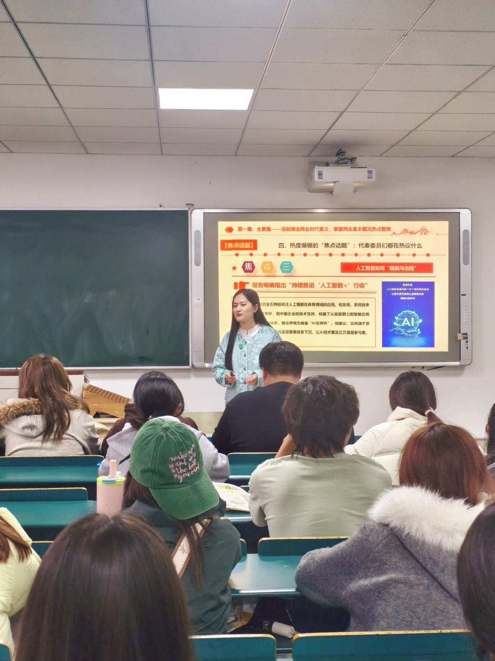 活动伊始,沈含笑围绕2026年全国两会报告核心内容,就新思想、新观点、新部署展开细致解读。她结合“中国服务”高质量发展、“内卷式”竞争综合整治等两会相关部署,引导同学们从宏观层面把握国家发展方向与政策导向,鼓励大家将个人职业规划与国家发展需求紧密结合,主动抓住时代机遇,脚踏实地锤炼过硬本领。随后,周菲紧扣两会“深化拓展‘人工智能+’”“完善人工智能治理”工作要求,以“人工智能在旅游行业的应用与思考”为主题,结合文旅学院旅游专业特色进行解读。她通过一系列行业实际案例的分享,剖析了人工智能为旅游产业带来的机遇与挑战,引导同学们思考如何在积极应用人工智能的同时,坚守行业底线、完善治理思维,为未来投身旅游行业、助力“中国服务”高质量发展做好充分准备。