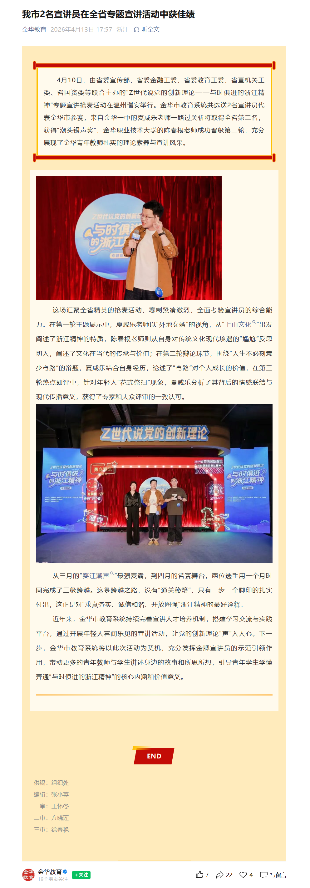 金华教育:我市2名宣讲员在全省专题宣讲活动中获佳绩